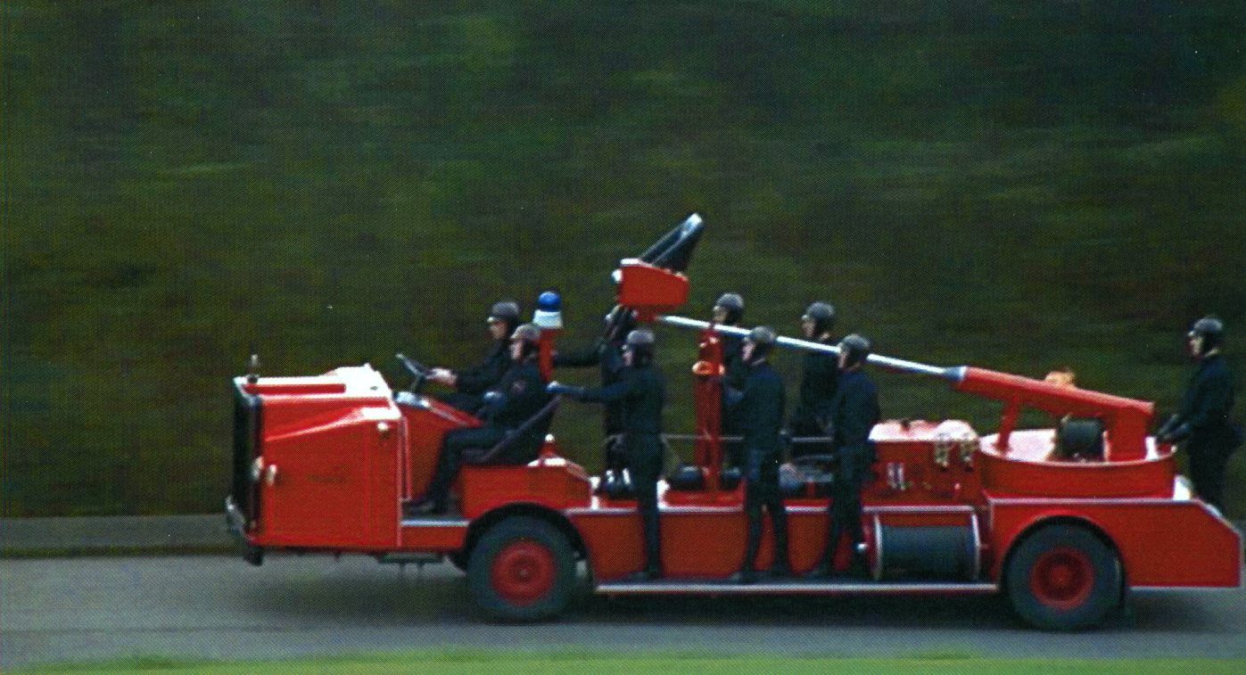 The brutalist architecture of Alton Estate in the London suburbs frames the firemen’s handiwork