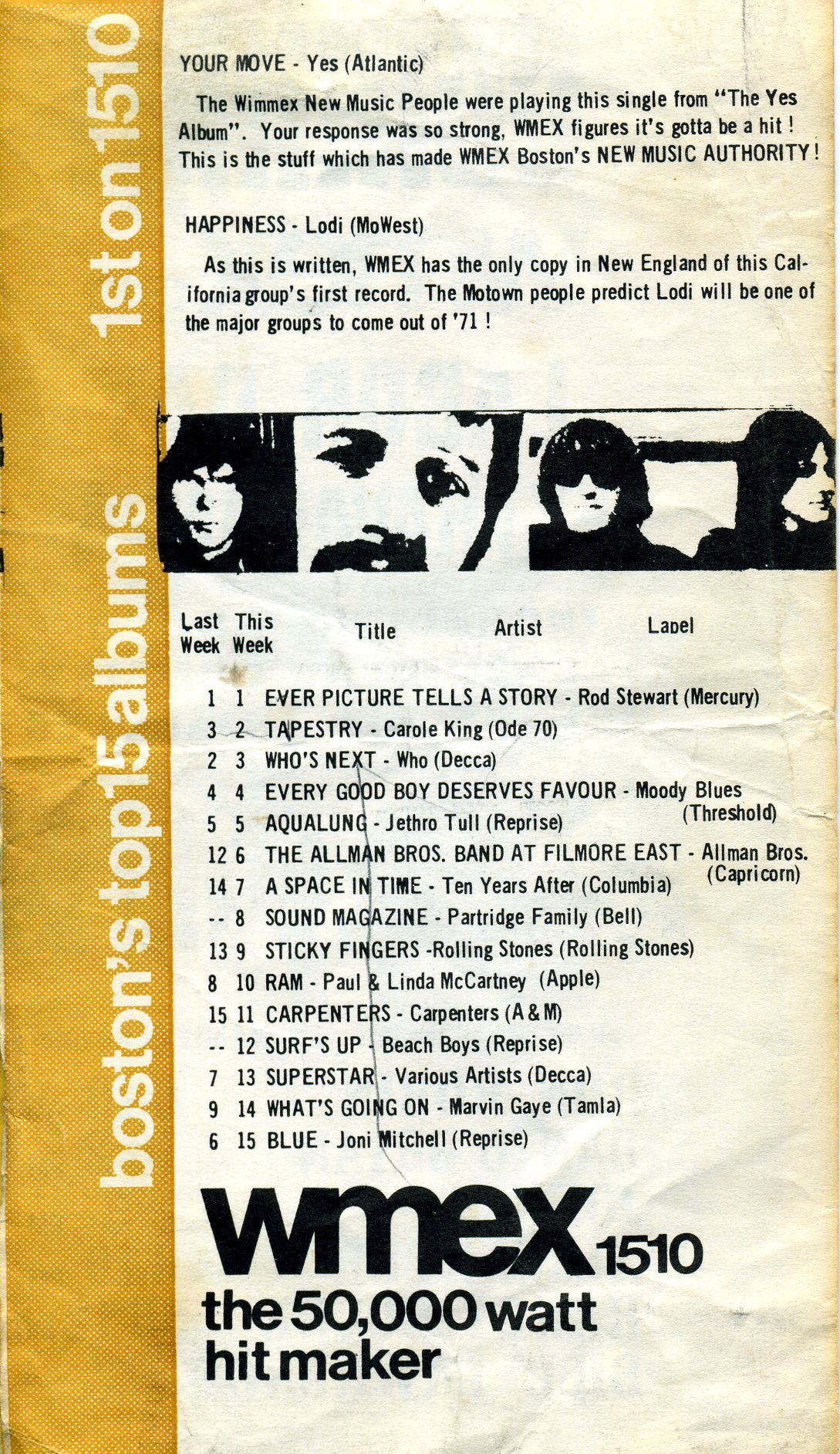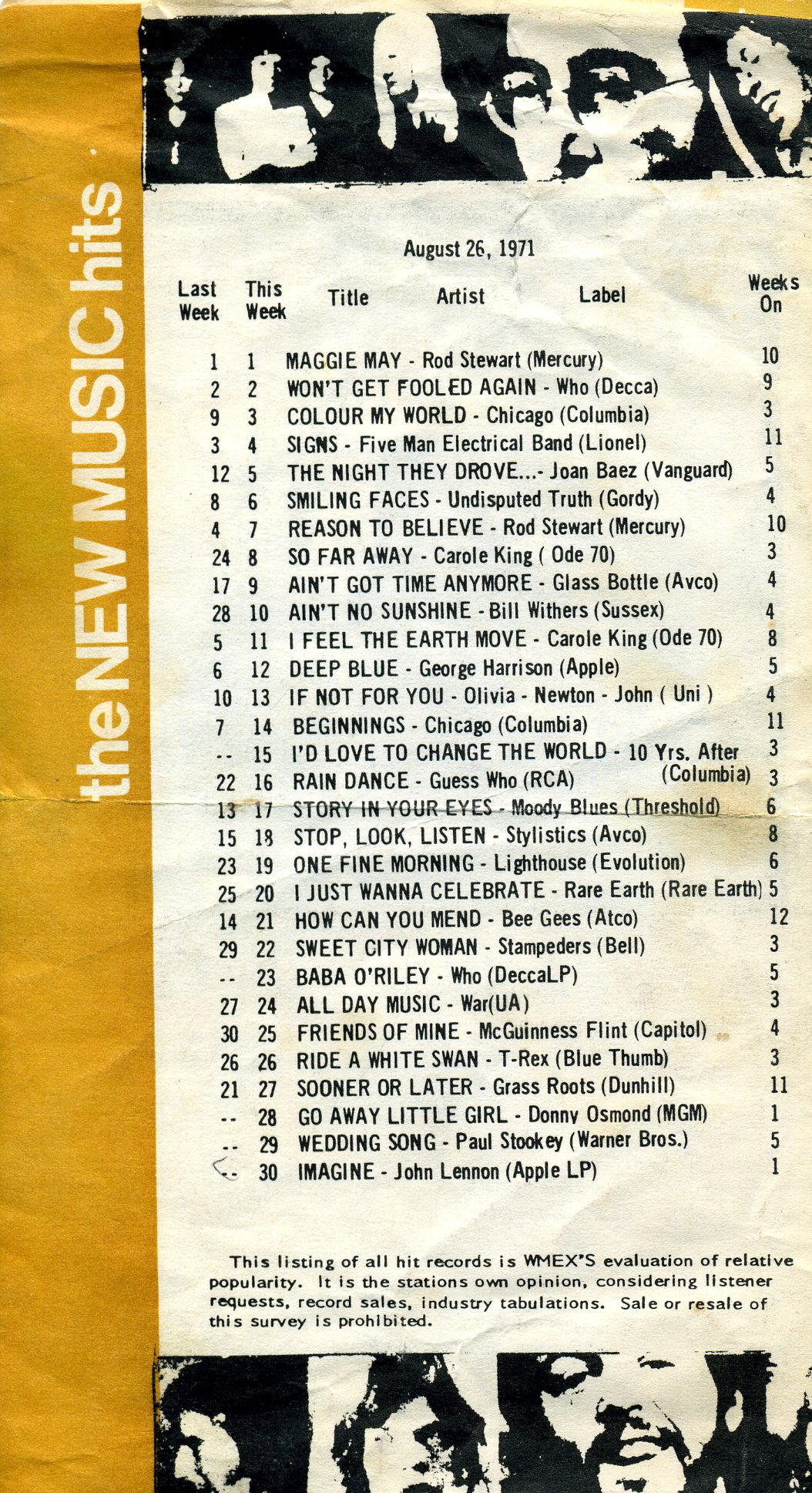 “Friends of Mine” McGuiness Flint. These appealing and unassuming folk-rockers probably couldn’t get played nowadays unless they owned a radio station. For shame. “Ride a White Swan” T. Rex. If you listened to the New Music Authority on 1510AM you wouldn’t have to wait around for “Bang a Gong” to get hip to Marc Bolan and his elfin ways. Of course, the first of many HUGE hits for him in the U.K. “Sooner or Later” the Grass Roots. One of the latter-day smashes for these AM pop princes. I’m pretty sure Creedy had left the band by then. “Go Away Little Girl” Donny Osmond. You know, I always thought that this ditty should have had an answer song from the fairer sex. There would be a mid-song spoken word part where the girl would say “Why don’t you go away first, Donny, and we’ll call it even.” “Wedding Song” Paul Stookey. Wow, two clunkers in a row. I said it was a great Top 30, not a perfect one. “Imagine” John Lennon. This actually didn’t become a hit until the fall and an international anthem after that. But that didn’t stop the new Music guys, though the progressive AM business model would not hold and as we young teens grew up and it was quickly onto WBCN and other FM rock outlets, including college radio in the 80s and beyond.