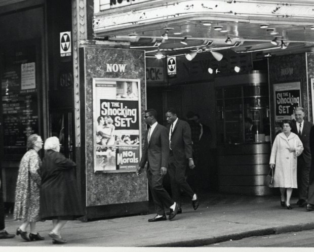 That makes sense because the people on the sidewalk are so nicely dressed in the “Mad Men” style of the day. Even the guy in the outside ticket booth has a suit and tie. Under the boldly projecting marquee, anyone could have a nice look-see at the poster for The Shocking Set (where “men were playthings”!!) or the one for “No Morals” where Jean (sic) Moreau, although she’s probably just looking for love in all the wrong places, is claimed to have “many men on the string.” This double billing seems to suggest some early strain of erotic feminism. It’s a notion may have caught the attention of the shifty-eyed lady in the white coat who is suspiciously close to the ticket booth—if so, that would explain her assumed husband’s sheepish grin. Nudge, nudge, wink, wink!