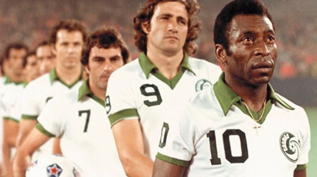 Pele lining up in front of his teammate/nemesis Giorgio Chinaglia.