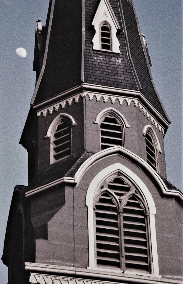 Each sunny school day at the noon recess, at the signal which was the tannery’s blaring lunchtime horn, we would look up at the steeple to see “the witch’s eye.” This would be a glint of sunshine off the church bell seen through the slats of the tower. I stared one last time for a glimpse of this, but it was no use. It was late afternoon already; the moon was even rising. The church, the factory and a lot else around it was closed for good. There would be no supernatural eye to look down on this broken world that had cursed itself.