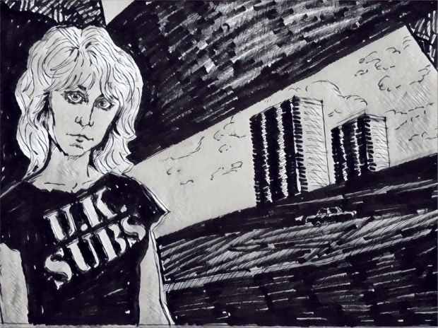 Never underestimate the symbolic value of the hated “tower blocks” of working-class London as rhetorical ammunition for punk rockers in their skirmish with the UK establishment of the late 1970s. On their second LP, This is the Modern World, the Jam posed under the same shadowing underpass as Sally did in the above drawing, with the same applied animus of inhumane council estates. This perceived cattling of the populace was immortalized in songs like the Clash’s “London’s Burning,” Chelsea’s “High-Rise Living” and XTC’s “Towers of London.”