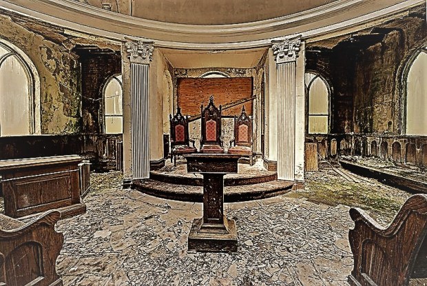 Crutch turned to look at us and nodded towards the back area. We stepped on bits of shattered tiles, past the apse and into a hallway. I peeked back and Domine had moved off the chair and was peering thru a cracked Palladian window down at the street. I paused with Hannah to look at some parabolic diagrams that remained on the wall. After a moment I suggested she should check out the old member’s lounge and kitchen. When she did, I lingered in the hall.