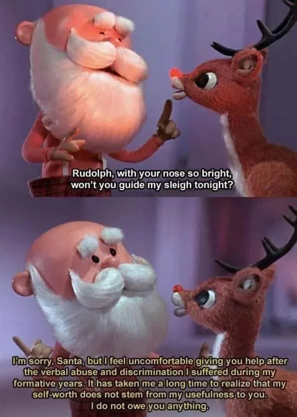 This perennial favorite celebrated its 60th anniversary this month by returning to NBC from whence it first aired. That it came out so long before the “safe space” era makes it great meme fodder for those who want to imagine the magnanimous Rudolph with a different answer to Santa’s famous question. This request for help coming after ol’ Ruddie Red Nose was practically disowned by his dad and bullied and ostracized by nearly everyone at the North Pole, forcing him into a dangerous (but ultimately rewarding) exile.