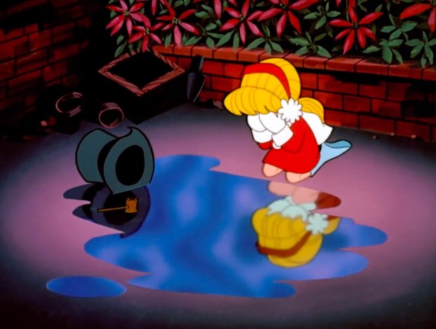 Otherwise, this is a grown-up story of how lovelorn Jack, crushing hard on the pretty but flighty Elisa, asks Father Winter if he might become human in an attempt to win her hand. She was a fangirl of ol’ Frost in his invisibility mode, but as a real boy it’s more like let’s-be-friends. Nevertheless, Jack proves himself in battle against the fearsome Kubla Khan, the Cossack King, who rules January Junction atop his mechanical horse and has at his disposal a steampunk army and an iron-plated sidekick called Dummy. (Kubla is memorably voiced by Paul Frees in his Boris Badunov voice).